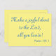Una postal que ofrece elogios inspiradores, este diseño presenta "Hagan un alegre grito al Señor, ¡todos ustedes aterrizan!" El salmo 100:1 está escrito en una bonita fuente azul sobre un fondo amarillo. Capturadores de ojos y encantadores, sus seres queridos con este saludo.