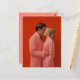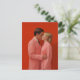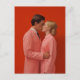 Foto minimalista de dos personas besándose con un traje rosado de fondo rojo