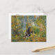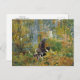 Postal de arte fino con la pintura acuarela de Winslow Homer (1836-1910) On the Trail (1889). Escena forestal de un hombre cazando con su perro recuperador de blanco y negro.