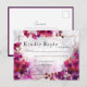 La tarjeta de boda RSVP, una pieza esencial dentro de la "Fuchsia Enchantment: Watercolor Boda Suite", cuenta con un delicioso frente adornado con el pintoresco telón de fondo de flores de fucsia y hiedra. En la parte superior, una leyenda audaz llama la atención: "Por favor, responda". Debajo, la fecha por la que se debe responder está elegantemente indicada, estableciendo el tono para las respuestas rápidas. Debajo de estos detalles, hay un amplio espacio para que los invitados inserten sus nombres e indiquen si aceptan o rechazan la invitación, lo que garantiza una respuesta perfecta y organizada. En la parte posterior, un fondo blanco limpio y crujiente espera. Aquí, se ha designado un espacio para que el receptor de la tarjeta predirija la tarjeta RSVP, lo que racionaliza el proceso para los huéspedes. Este diseño práctico asegura que la tarjeta RSVP "Fuchsia Encantamiento: Watercolor Boda Suite" no sólo capta la esencia de la celebración sino que también facilita un mecanismo de respuesta fluido y eficiente para los invitados