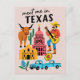 Todo es más grande en el 'Estado de la Estrella Solitaria', y también lo es el encanto de esta postal de 'Encuentrame en Texas'! Esta encantadora postal ilustrada presenta una divertida colección de iconos de Texas en estilo doodle, capturando el espíritu rudo de vaquero del estado, su rica historia y vibrante cultura. Muestra todo, desde un orgulloso toro longhorn y un vaquero tocando la guitarra hasta el histórico Alamo y el icónico Capitolio del Estado. Las ilustraciones juguetonas y la letra clara hacen de esta postal un homenaje único y memorable a Texas, EE. UU.