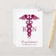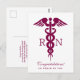 Tarjeta de felicitación para graduada de enfermería con un símbolo de caduceo rojo elegante con las letras R N a ambos lados. Diseño minimalista simple.