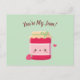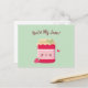 Una postal con el ilustracion de una botella de mermelada de fresa tibia con una fresa tendida a un lado. La leyenda del juego de palabras dulce dice "¡Eres mi mermelada!" ¡Perfecto como saludo Día de San Valentín!