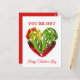 Fotografía de varios tipos de pimientos picantes rojos, amarillos y verdes formando un corazón con fondo blanco, con textos editables 'Estás caliente' y 'Feliz Día de San Valentín' delante y mensaje en la parte trasera