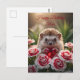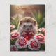 Un erizo lindo sosteniendo un corazón de granate rojo se sienta en un parche de claveles rojos y blancos.