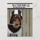 Otra linda foto en la serie de postales antropomórficas: Las aventuras de Aliado, el perro Kelpie australiano. Aquí está vestida como prisionera 4372 en Allycatraz, Penitenciaria K9. Está tomando un descanso de 5 minutos para salir de prisión. ¡Buena suerte Ally! Fotógrafo: Louise Docker