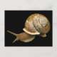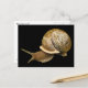 Esta postal muestra un caracol de jardín que emerge de su caparazón sobre un fondo negro. Es un molusco gasterópodo terrestre con una concha marrón y beige en el patrón espiral clásico. Sus tentáculos cada uno tienen un ojo al final y apuntan hacia delante mientras se da cuenta hacia dónde ir, empujados por su fuerte pie muscular.
