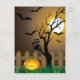 Un ilustracion de Halloween con un árbol aterrador con un gato, murciélagos espeluznantes volando, una luna llena brillante y una calabaza espeluznante.
