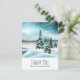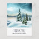 Tarjeta de agradecimiento con una hermosa pintura de acuarela. Árboles cubiertos de nieve en una escena invernal. Copos de nieve cayendo sobre un suelo nevado. Nubes esponjosas blancas y azules en el cielo. Con un lago congelado en el fondo. Ambiente tranquilo y sombrío.