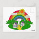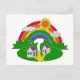 Ilustracion bucólico con efecto 3D que muestra el paisaje rural y algunas cabañas rurales bajo el sol y el arcoiris
