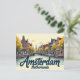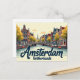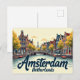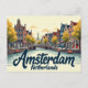 Esta postal retro capta el espíritu clásico de Ámsterdam con sus pintorescos canales, sus estrechas casas y sus encantadoras bicicletas bajo una suave luz dorada. Un homenaje nostálgico a la vibrante capital holandesa, ideal para los amantes de la cosecha, viajeros y coleccionistas de encanto europeo.