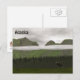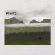 Una pintura de estilo "primitivo" o folclórico de coníferas verdes y montañas en un día muy gris con nubes bajas. Un alce macho (Alces alces) en primer plano da escala a la escena. Texto personalizable que dice "Alaska" también aparece.