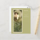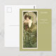 Postal con el ilustracion artístico de Alphonse Mucha (1860-1939) titulado Esmeralda de la serie de piedras preciosas (1900). Un retrato de una mujer de moda en un vestido verde, con follaje verde en primer plano. La silla tiene cabezas de animales inspiradas en una silla de propiedad de Mucha.