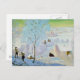 Escena de esquí de época con gente en la pista de esquí sobre un pueblo. Fina arte del artista ruso Boris Kustodiev.