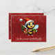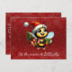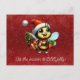 Una adorable abeja feliz sosteniendo regalos en sus alas, sobre un fondo rojo de copo de nieve. "'Es la temporada para la fiesta de BEE jolly" texto al frente con el mensaje de los Navidades en la parte de atrás que también es un fondo rojo de copo de nieve.