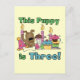 Diseño de cachorros camisetas de 3 años, bodysuit, imanes, tarjetas, bolsos de tote, botones de 3 años, y más con velas de cumpleaños, un adorable cachorro marrón, un gorra fiesta, ¡y muchos dulces de cumpleaños! El texto dice "¡Este cachorro es 3!".