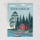 imagen vectorial de Estocolmo, Suecia, centrada en una escena insular pacífica en el archipiélago de Estocolmo. El hotel cuenta con una casa tradicional de madera roja, altos pinos y un pequeño barco con agua cristalina. Mantenga el cielo azul brillante con algunas nubes suaves. Usa rojo burdeos, azul marino y marfil. Añada "ESTOCOLMO" verticalmente a la izquierda en un tipo de letra sans-serif elegante y moderno.