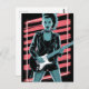 Una ilustración vectorial dinámica y de alto contraste de una estrella del rock o guitarrista femenina feroz y elegante. La mujer se representa con un peinado de cola de caballo/mohawk puntiagudo, un collar de perro con tachuelas, una chaqueta de cuero clásica y medias de red de pescar. Ella se mantiene confiada sosteniendo una guitarra eléctrica. El gráfico utiliza una paleta de colores estilizada y limitada con tonos fríos de cian/verde azulado para la piel y la ropa, contrastados con franjas rojas/rosadas en el fondo y un marco rectangular rosa neón.