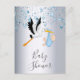 Elegante, clásico, glamorosa invitación a la ducha de bebé para celebrar a un niño. Estrellas en caída azul y una cigüeña voladora, pájaro sosteniendo a un bebé. Fondo de aspecto metálico de plata falsa. Con el texto: Baby Shower en el frente escrito con un guión moderno de estilo con letras de color gris oscuro. Añade los detalles del evento en letras de color gris oscuro.