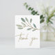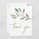 Este eucalipto con veta dorada gracias postal es perfecto para una elegante boda. El diseño es sencillo y delicado, con un purpurina de oro falso que recubre las ramas de las hojas verdes de oliva. Personalice la tarjeta postal con su mensaje de agradecimiento, nombres y dirección de retorno. Nota: Este diseño no tiene purpurina de oro real. Es un gráfico de alta calidad hecho para parecer un shimmer dorado.