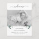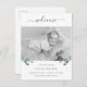 Esta postal de presentación de un bebé, simple y elegante, presenta hojas de eucalipto de color verde minimalista sobre un fondo blanco limpio con escritura manuscrita. Añade tu foto favorita de tu recién nacido para completar este aspecto botánico.