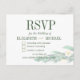 Una idea sencilla para que sus invitados puedan responder fácilmente a sus invitaciones de boda con una marca rápida en la caja, ya sea en la tarjeta o visitando la dirección de su sitio web que aparece en la tarjeta. Tarjeta RSVP de boda floral con follaje eucalipto. Verde con flores blancas. Todos esos detalles adicionales, que necesitan ser desprotegidos, se pueden personalizar en esta tarjeta. La información de la espalda se cambia fácilmente a la tuya. El guión moderno se cambia fácilmente para su propia información personalizado. Esta postal RSVP completa el diseño de una suite boda de Just Fine Designs.