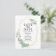 Moderna y elegante color de agua Eucalyptus Greenery Engagement Invitación Save The Date Postcard incluye hojas de eucalipto en un marco geométrico de oro.