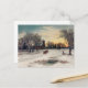 Una escena de invierno muestra un apacible paisaje con un trineo tirado por un caballo que recorre una carretera de pueblo cubierta de nieve y bordeada de árboles desnudos. Al fondo, una iglesia se erige bajo una luna creciente en un vibrante cielo atardecer.