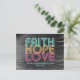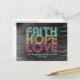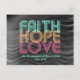 Elegante fuente retro delgada con colores bonitos y gruesos turquesa, rosa y naranja con un sutil fondo de onda sina negra. Muestra tu fe, esperanza y amor con esta bella y moderna y moderna escritura de versículos de la Biblia de 1 Corinthians 13:13