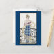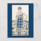 Obra de arte de moda vintage que muestra a una joven con una falda estrecha a cuadros azules. Está de pie frente a una barandilla de balcón de hierro ornamentado