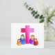 Un ilustracion íntimo de una familia cristiana junto a un símbolo gigante de la cruz. Todos tienen caras sonrientes felices. El área de fondo de esta imagen es completamente transparente para que pueda personalizar fácilmente y elegir su propio color de fondo. Imagen disponible en varios regalos y productos.