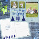 Una plantilla de postal de 3 collage de fotos para que puedas personalizar para los elegantes saludos navideños y entre religiones azul pastel Merry Happy Everything (¡Feliz Navidad!) los saludos navideños hacen que sea una brisa crear tus propias postales de Chrismukkah. El frente de estas postales de fotos azul claro y la marina de moda cuentan con árboles navideños modernos y una Menorah azul marino junto con dos plantillas de fotos pequeñas y grandes que te facilitan añadir tus fotos al diseño. Cada foto aparecerá en el diseño con esquinas redondeadas de moda y un borde delgado de marco de azul medio. Todo el texto puede ser personalizado, desde MERRY HAPPY TODO en un guión estilizado azul profundo al espacio para tu nombre y el año en el frente que es igual de fácil de personalizar. Estas postales de collage de fotos se revierten para revelar un borde de azul pálido, el árbol navideño azul marino y el diseño de Hanukkah Menorah en la parte inferior y texto impreso opcional para su saludo de vacaciones. Perfecto para parejas y familias que mezclan las religiones cristiana y judía o como alternativa inclusiva de la tarifa de saludos navideños estándar, estas postales de vacaciones personalizadas en azul marino y pastel son una forma divertida e informal de enviar los deseos de vacaciones este año.