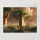 Hermosa y surrealista postal artística de fantasía presenta "Bosque Baobab de Madagascar" con árboles enormes en medio de una niebla matutina