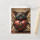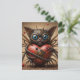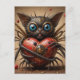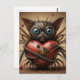 Un extraño gato de araña sosteniendo un corazón de vidrio rojo con telas de oro y emblema de araña sobre él.