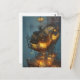 Fantasy art postcard presenta una vista aérea de una aparentemente flotante ciudad de Steampunk futurista con ventanas ámbar iluminadas dentro de edificios de varias plantas.