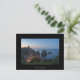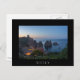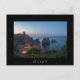 Postal de las grandes rocas de Faraglioni en el agua del mar Mediterráneo y el viejo Tonnara rojo, fábrica de atún en Scopello, en la costa norte de Sicilia, Italia en la Hora Azul del atardecer con un borde negro y el texto 'Sicilia'.