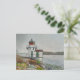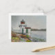 El faro de Squirrel Point se encuentra en las orillas del río Kennebec en Maine en un día oscuro y brumoso. La orilla opuesta cerca de Phippsburg está envuelta en niebla. El liquen crece en el techo de la casa de la campana y en las rocas en primer plano. La hierba nueva de primavera brota alrededor de los arbustos todavía desnudos después del largo invierno. El sargazo golpea contra la orilla rocosa mostrando lo cerca que está el faro del agua.
