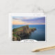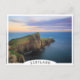Postal de un paisaje con el icónico Faro Neist Point, construido en los acantilados en la costa oeste de la isla de Skye, una de las hebrides en Escocia, al atardecer con un borde blanco y el texto 'Escocia'.
