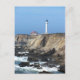 Faro en Point Arena, California. Las olas se estrellan en la costa rocosa bajo los acantilados. Un cielo azul brillante.