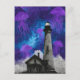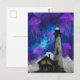Mariscas moradas flotando en el aire alrededor de un faro blanco y negro vintage