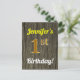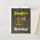 Este sencillo, personalizable, diseño de postales con temática de cumpleaños presenta un mensaje de personalizable como "¡Primer cumpleaños de Jennifer!" en la parte delantera, donde se puede cambiar el nombre, y con la "primera" que tiene un aspecto falso dorado. En la parte delantera también hay un fondo de madera falsa. La parte posterior incluye un mensaje personalizado y una dirección de destinatario de personalizable. El mensaje y/o la dirección del destinatario se pueden dejar en blanco si se van a rellenar a mano. Podría ser enviado como un saludo a alguien que está celebrando su primer cumpleaños, o tal vez postales como estas podrían ser usadas como invitaciones cuando inviten a los invitados a un fiesta que está siendo llevado a cabo para celebrar el primer cumpleaños de alguien. [~Z0000106]