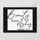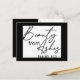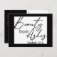 Haga una declaración audaz con nuestro moderno diseño de postal con bloques en blanco y negro en el frente. En un guión elegante, el mensaje de la fe dice "Belleza de las cenizas" - desde Isaías este verso encarna resiliencia y esperanza. En la parte posterior, una combinación de colores continúa la estética elegante, con un lado negro y el otro blanco. El personalizable gris claro destaca en el fondo negro, permitiendo un mensaje minimalista pero impactante. Esta postal es perfecta para transmitir una gran declaración con un diseño mínimo, lo que la hace ideal para compartir palabras de inspiración, ánimo o gratitud de una manera elegante y contemporánea.