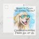 Tarjeta de felicitación por jubilación divertida y moderna con un golden retriever en una playa tropical. Diseño original creado a partir de una de nuestras acuarelas pintadas a mano.