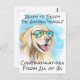 Tarjeta de felicitación por jubilación moderna y adorable con un divertido perro de aguas dorado en una playa tropical. Diseño original creado a partir de una de nuestras acuarelas pintadas a mano.