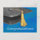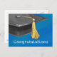¡Tú o alguien que conoces se está graduando! ¡Sí! Envía tus felicitaciones con nuestro elegante diseño con nuestro arte original de un gorro de graduación azul con una tassel amarillo contra un fondo negro texturado y la palabra, Felicitaciones en el fondo. Hay diseños personalizados disponibles.