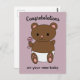 Un adorable osito de peluche sostiene un sonajero rosa y morado mientras usa un pañal. El texto dice, "Felicitaciones" y "por tu nuevo bebé". ¡Perfecto para los nuevos padres en tu vida!