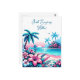 Arte de píxeles que parece bordado que representa una imagen de un océano azul, palmeras y flores tropicales rosadas. Feliz aniversario.