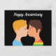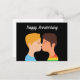 Una linda tarjeta de aniversario de bodas para dos hombres gays que celebran su vida juntos. Cuenta con dos chicos compartiendo un beso. Hay un hombre rubio con camisa azul y un chico moreno con camiseta del arcoíris bajo el texto Feliz Aniversario.