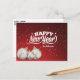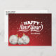 Tipografía blanca "Feliz Año Nuevo" en un fondo rojo, degradado con cruces y estrellas blancas, y tres ornamentos en baudible plateado juntos en la parte inferior izquierda. Personalizar frontal con el nombre de la familia y una dirección de retorno en la parte posterior.