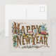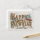 Postal Feliz Año Nuevo en troncos de árboles, bellotas y